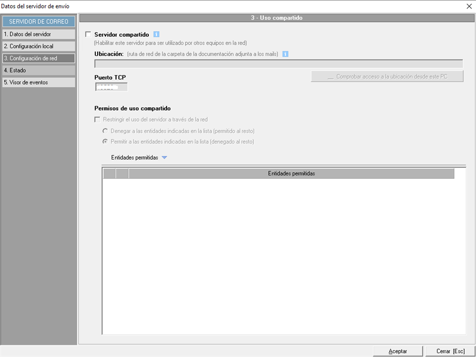 Un servidor de correo puede configurarse como servidor de red o compartido, de manera que se puede indicar que varios usuarios, entidades o trabajos, utilicen ese servidor para realizar los envíos de emails aunque ejecuten Prevengos en equipos diferentes del que tiene instalado el servidor. Los equipos deben tener conexión con el servidor de correo, y además, deben tener permisos de lectura y escritura sobre la carpeta en la que se almacenarán los documentos que se adjunten a los emails. En este punto podrán indicar si el servidor está habilitado para un uso compartido, la ruta donde se generan los documentos temporales en el caso de que haya adjuntos, el puerto que se va utilizar y las entidades permitidas o restringidas para el uso de dicho servidor.