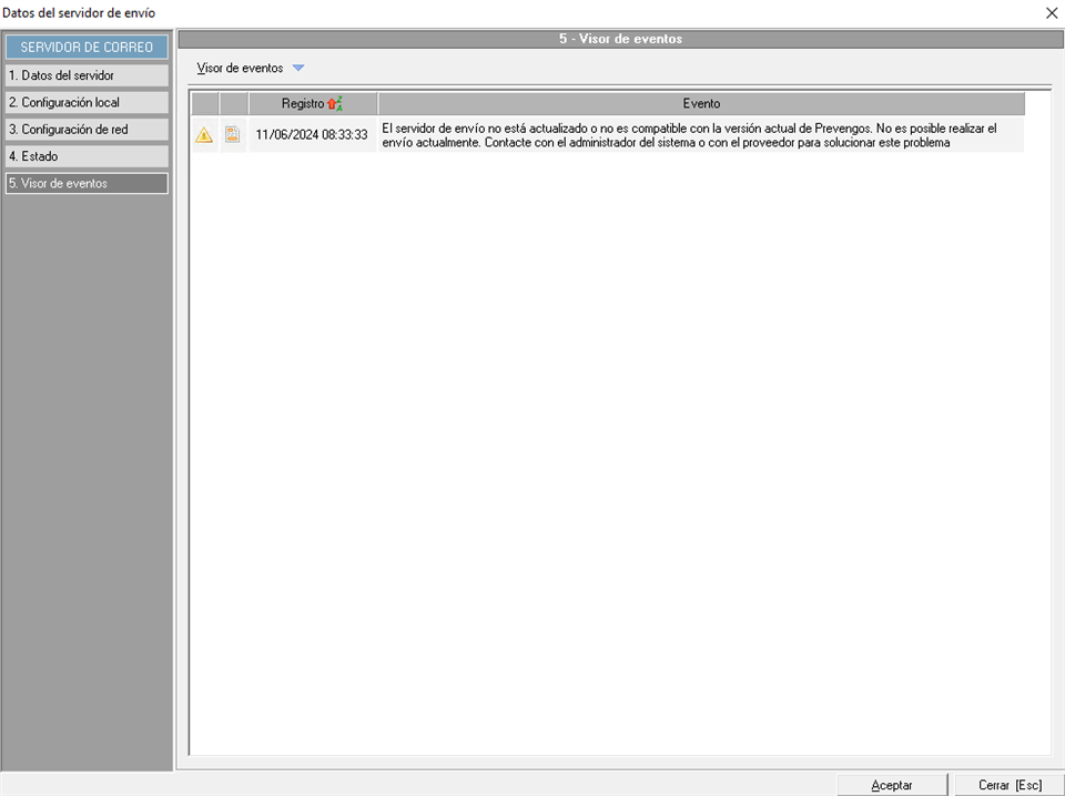 - Rojo. Si ha pasado más de una hora y el servidor no responde. Debe ir a los servicios de windows y buscar 'Prevengos mail server' y reiniciarlo. Si sigue estando en rojo, debe hacer doble clic y probar si al pulsar sobre 'Comprobar configuración' y ver si está conecta correctamente o hay algún error.
