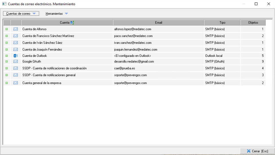 Cuentas: Cuentas de correo definidas en Prevengos. Cada cuenta de correo se podrá asociar a un usuario o varios. Además, cada entidad de sistema tendrá asociada una única cuenta (no puede tener varias). Un usuario puede mandar por distintas cuentas, según lo que esté mandando podrá elegir la cuenta de envío.