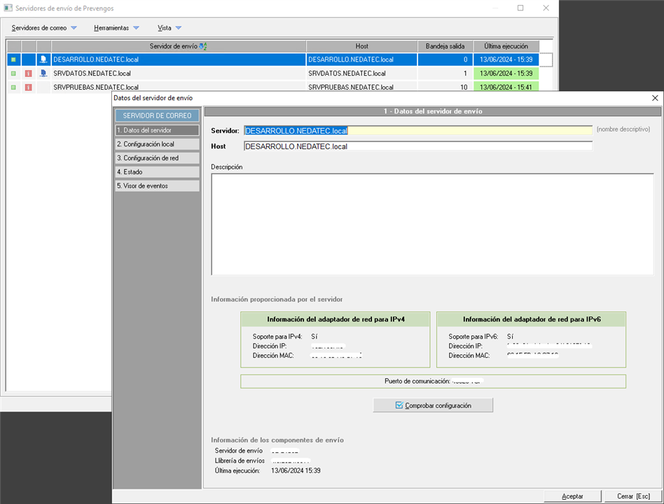 - Información proporcionada por el servidor. Se muestran los datos del adaptador de red del equipo en el que está instalado el servidor de correo.