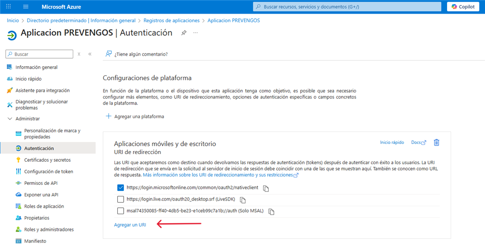 Si diera error al generar token añadir en Azure y en Prevengos: http://127.0.0.1:57122