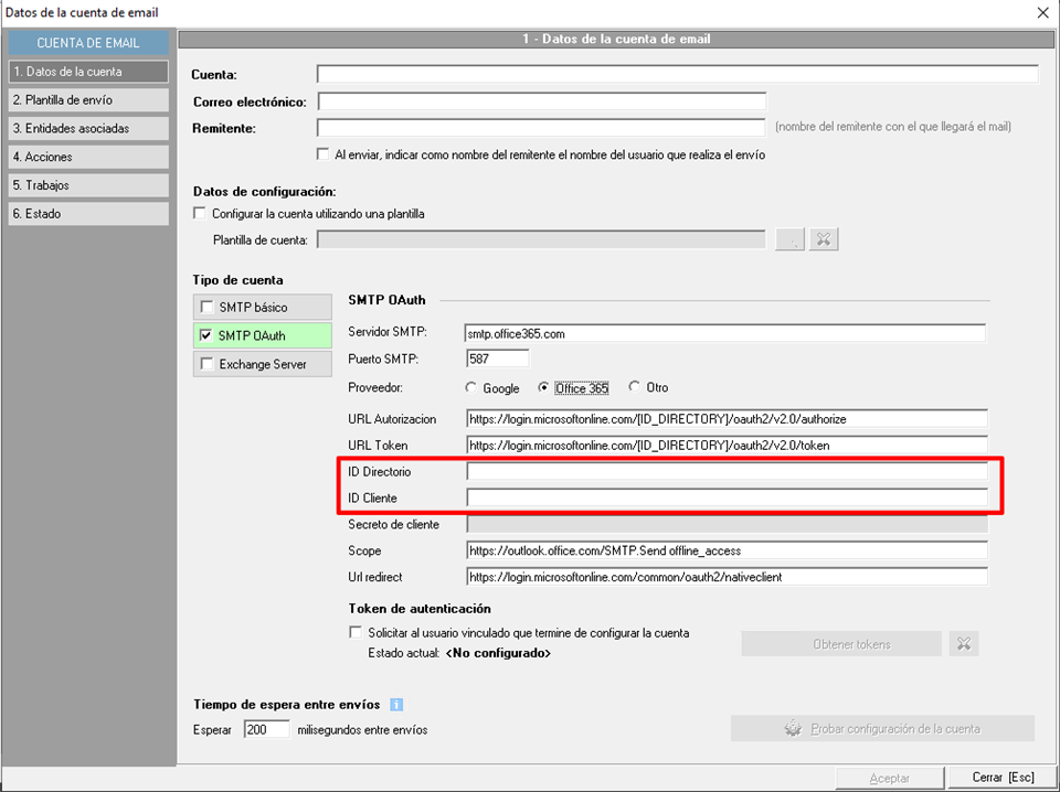 En el parámetro "URL Autorización" y "URL Token" tendrá que introducir manualmente justo en la parte de la URL donde pone [ID_DIRECTORY] la ID Directorio obtenida en la configuración de la API de Microsoft aparte de introducirla en su campo correspondiente ID Directorio.