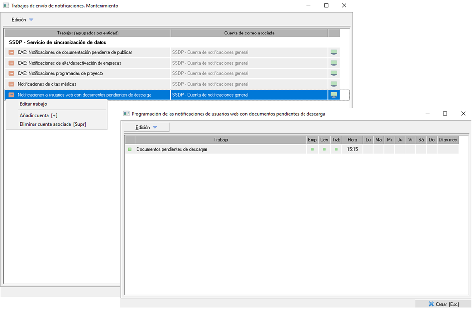 Para este caso, esta notificación debe ser configurada aquí. Para editarla, puede hacer click derecho sobre la misma y pulsar sobre "Editar trabajo":