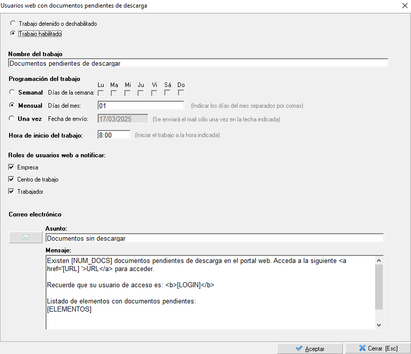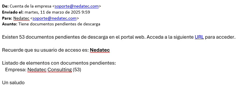 En cuanto al asunto y al mensaje, podrá indicar el número de documentos sin descargar utilizando el marcador "[NUM_DOCS]". Además, también podrá indicar el nombre del elemento al que accede el usuario web (Empresas, centros o trabajador). De esta manera, se puede conseguir un resultado similar al de la siguiente imagen: