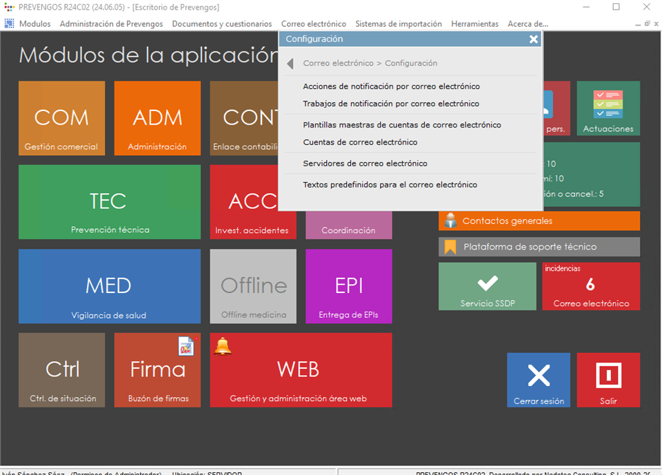 El servidor de envio de email se instalará con cada puesto de trabajo de Prevengos y con la instalación de cualquiera de las aplicaciones externas de Prevengos (Los distintos portales web, Servicio SSDP, Servicio de impresión webapp). Además dispondrá de un instalador independiente, en el caso de que quiera instalar un servidor de envío en una máquina independiente, debe tener en cuenta que esta máquina debe tener acceso a la llave de Prevengos, a la base de datos de Prevengos y a la ubicación de la documentación de Prevengos.