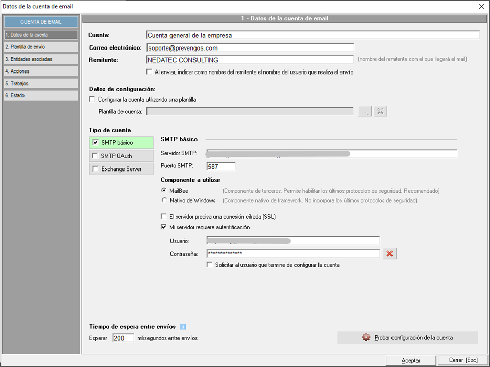 En la parte inferior derecha del formulario, encontrarán un botón con el que probar la configuración de la cuenta, de manera que puedan confirmar que el envío se realiza correctamente con la configuración realizada.