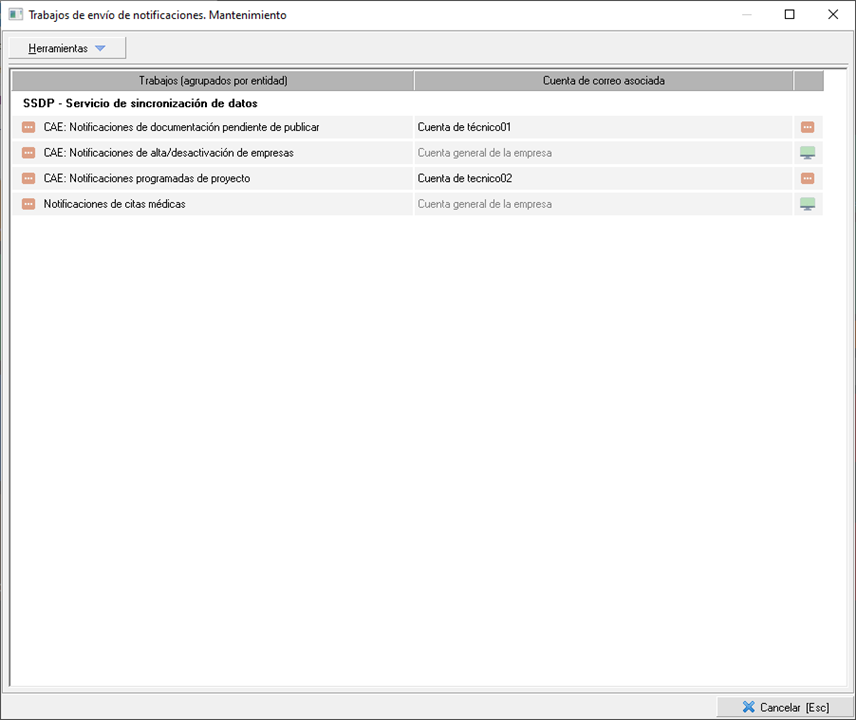 En aquellos casos en los que no se defina una cuenta de correo, los mails se enviarán desde la cuenta de correo asociada a la entidad SSDP - Servicio de sincronización de datos. Estos casos los podrá diferenciar porque en la imagen aparece la cuenta de correo en color gris, a diferencia de los trabajos para los que sí se ha definido una cuenta, que aparecerá en color negro.