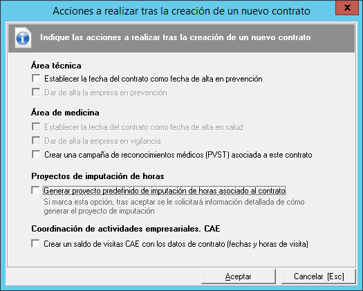 Al finalizar la generación del contrato se muestra este formulario, que se puede omitir con el botón "Cancelar", que permite la generación de campañas de reconocimientos (PVST) y proyectos de imputación si marca las casillas "Crear una campaña de reconocimientos médicos (PVST) asociada a este contrato" y "Generar proyecto predefinido de imputación de horas asociado al contrato".