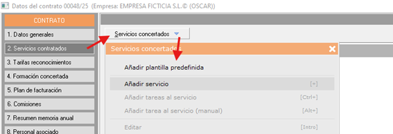 El "Punto 2. Servicios contratados" recogerá todos los servicios que nuestro cliente contratará. Si el contrato viene de un presupuesto, este apartado ya vendrá rellenado, si no, añadiremos los servicios manualmente haciendo Clic derecho > Añadir servicio