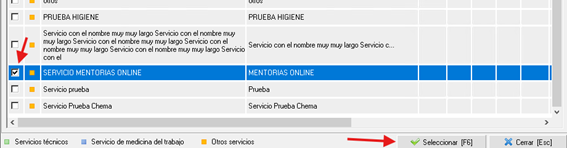 Seleccionamos en la casilla izquierda, los servicios a añadir y hacemos clic en Seleccionar (F6)