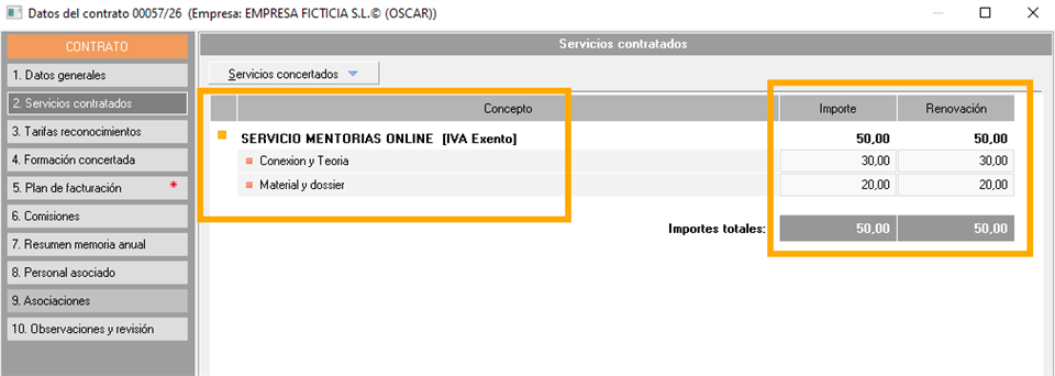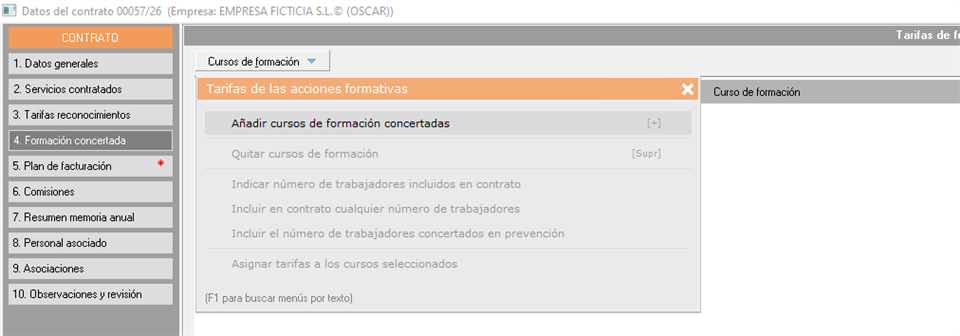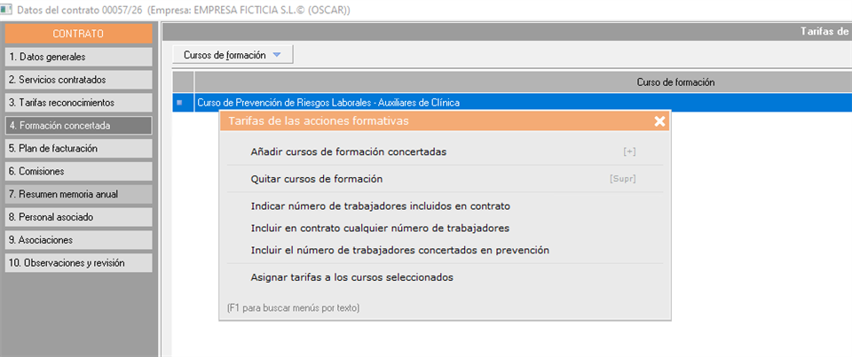 En el "Punto 4. Formación concertada” definiremos los cursos de formación. Este apartado es similar al de las tarifas de reconocimientos médicos y analíticas, pero en este caso aplicado sobre los cursos de formación contratados.