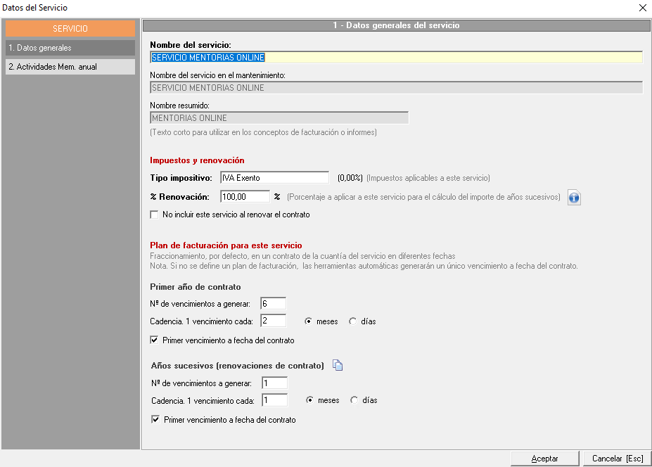 NOTA: Todos los cambios que hagamos en este servicio que hemos incluido únicamente tendrán efecto y se aplicarán en este contrato, no modificará la configuración base del mismo, es decir, si volvemos a añadir este servicio en otro contrato, no se verán los cambios que hacemos ahora, sino que se añadirá con su configuración inicial por defecto.