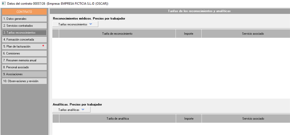 En el "Punto 3. Tarifas reconocimientos" definiremos las tarifas para los reconocimientos médicos y las analíticas para nuestros trabajadores. Estas tarifas se aplicarán cuando nuestros trabajadores realicen cualquiera de los dos servicios.