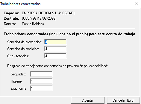 Incluir el número de trabajadores concertados en prevención: Con esta opción, el programa grabará el número de trabajadores que se hayan indicado anteriormente en el apartado '2. Servicios contratados', en concreto en el campo 'Número total de trabajadores incluidos en el precio - Servicios de prevención'.