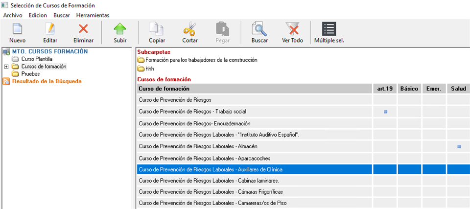Esta opción nos llevará al mantenimiento de cursos de formación. Desde el mantenimiento será donde selecionaremos los cursos que vamos a aplicar en el contrato que previamente hemos creado.