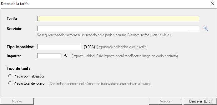Asignar tarifas a los cursos seleccionados: Para asignar una tarifa, utilizarán la opción 'Asignar tarifa a los cursos seleccionados'. que les llevará al mantenimiento de tarifas de formación en el cuál podrán elegir o crear las tarifas, indicando si son precios por trabajador o por curso completo. Recordar que esta tarifas deben ir asociadas a un servicio para poder facturarlos.