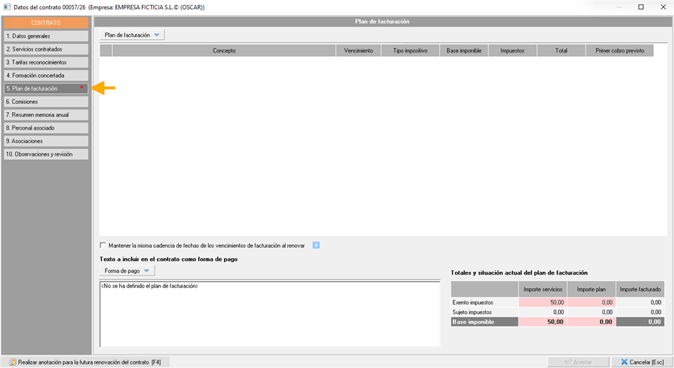 En el Plan de Facturación será donde definirémos los fraccionamientos de pago, los vencimientos y los precios de los servicios que se han contratado en el contrado. El asterisco rojo a la derecha de Plan de facturación nos indica que debemos realizar un plan de facturación en este contrato para continuar.