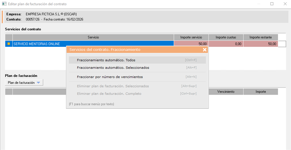 - Editar plan de facturación (automático): En esta opción se definirán los vencimientos (Cuotas) de manera automática según la configuración que los servicios añadidos tuvieran en su mantenimiento. Para aplicar el fraccionamiento hacemos clic derecho en el servicio > Fraccionamiento automático. Todos.