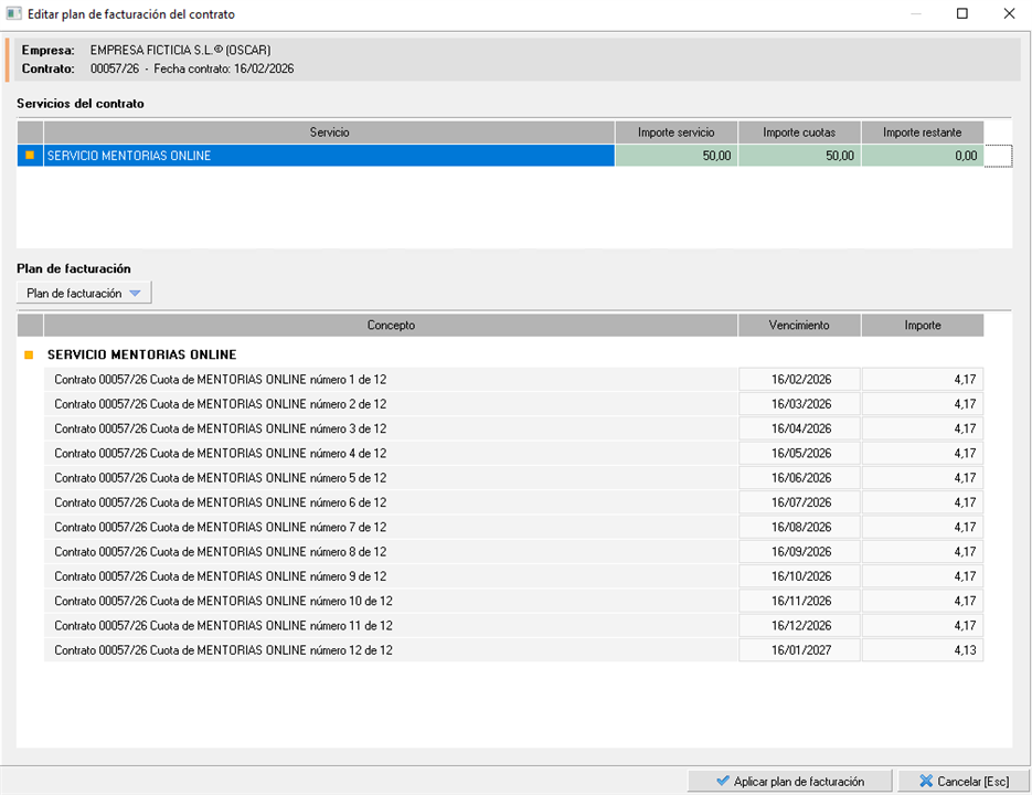 Una vez definido el fraccionamiento, aplicarémos los cambios. Nos aparecerán ya definidas todas las cuotas del plan de facturación, en la parte inferior, con su Vencimiento e importe a aplicar. Ahora hacemos clic en Aplicar plan de facturación. para implementarlo en el contrato.