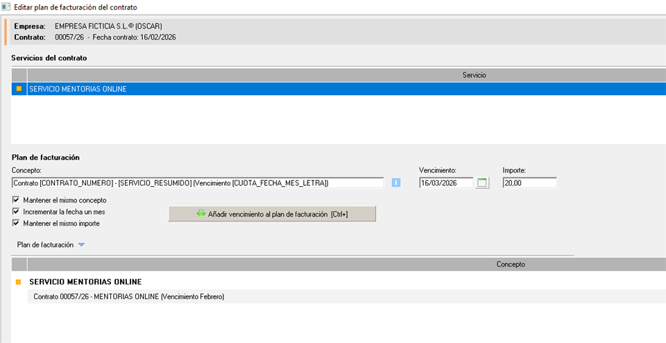 En esta opción realizaremos el plan de facturación de manera manual. Seleccionaremos el servicio, elegiremos la fecha del vencimiento (cuota), el importe de la cuota y la añadiremos al plan de facturación haciendo clic en Añadir vencimiento al plan de facturación.