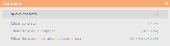 Crearemos un contrato nuevo sin ningún dato previo. Para ello haremos clic en la empresa donde queremos crear el contrato, clicamos en el Menú Rápido > Área de administración > Contratos > Nuevo contrato