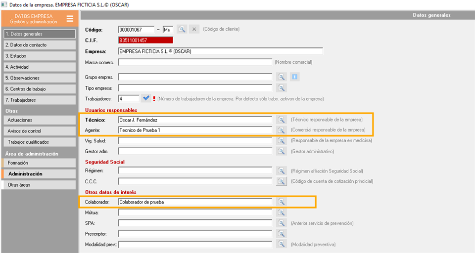 Una vez definidos los porcentajes de comisión para asesorías/colaboradores, técnicos y comerciales, tendrán que relacionar la empresa con el técnico, el comercial o el colaborador correspondiente a ese cliente. Esta relación la establecerán dentro de la ficha de la empresa, en el apartado de los Datos generales.