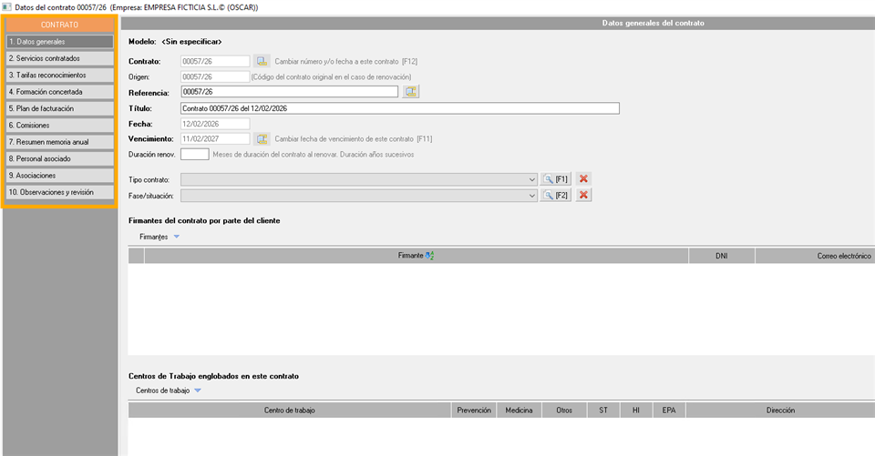 - Tipo contrato: Define qué estás vendiendo (PRL, Medicina, Formación...). Según lo que elijas aquí, el programa activará unas opciones u otras.
