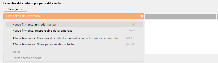 - Añadir firmantes. Personas de contacto marcadas como firmantes de contrato.: Busca y añade directamente a las personas de la empresa que ya tienen activada la casilla firmante en su ficha de contacto.