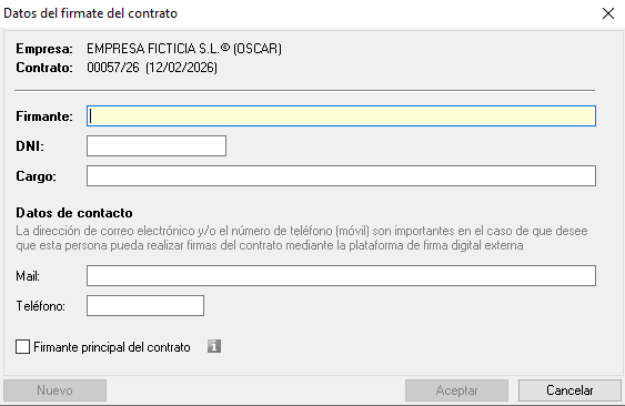 - Nuevo firmante. Responsable de la empresa: Carga automáticamente los datos del directivo o gerente que figura como el responsable principal en la ficha de la empresa.