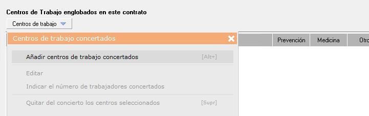 - Una vez añadido el Centro de trabajo, podrémos editar los trabajadores concertados haciendo clic derecho en el centro > Editar datos de concierto con el centro seleccionado. El centro se carga por defecto en el contrato con el número de trabajadores concertados y por especialidad según la información de su ficha de datos. Esta opción permite editar dicha información manualmente.