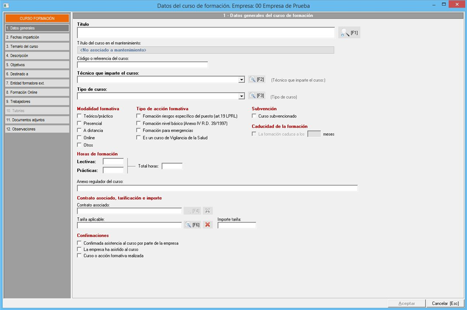 - Titulo. Campo obligatorio donde deberemos elegir el curso de formación del mantenimiento. Para ello pulsaremos el botón [F1] con el que se nos abre el mantenimiento de cursos de formación donde elegimos la acción formativa. Una vez seleccionado se rellenaran varios campos provenientes del mantenimiento.