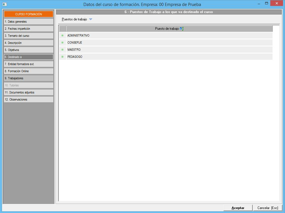 Seguidamente tenemos la pestaña Destinado a donde podemos ver los puestos de trabajo establecidos en el mantenimiento de cursos a los que va dirigida la formación.
