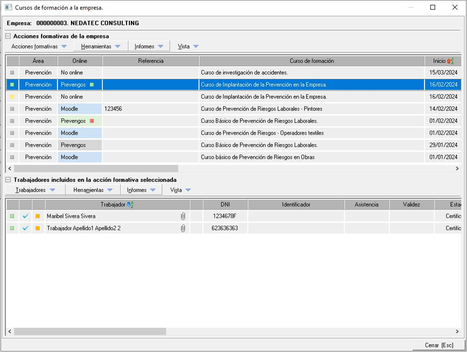 - Listado de trabajadores incluidos en el curso seleccionado: