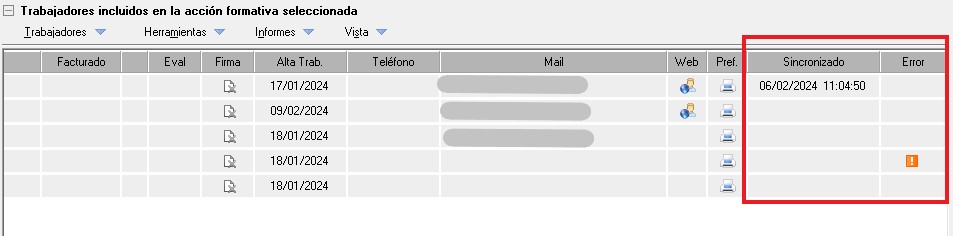 En el caso de que el curso se vaya a realizar en Moodle, en las últimas columnas del listado de trabajadores, se podrá comprobar si se han sincronizado con Moodle, y en caso de error en la sincronización, podrá comprobarse el motivo.