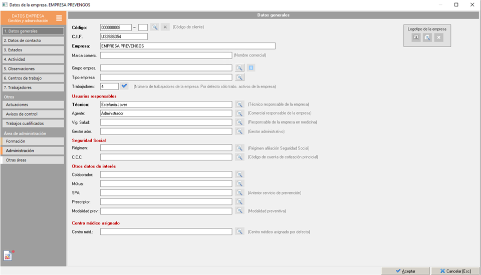 Como en todas las pantallas de prevengos, los campos que están en negrita son campos obligatorios para que se habilite el botón [Aceptar] y poder guardar la empresa. Vemos que Prevengos nos asigna el siguiente número disponible en el campo Código aunque podemos modificarlo y asignarle el que queramos siempre que esté disponible. A la derecha del campo de código disponemos del campo para establecer un sufijo a la empresa, el cual nos ayudara a la hora de catalogar a las empresas y asignar permisos de acceso a usuarios del aplicativo. Debemos introducir, obligatoriamente, el CIF, nombre de la empresa y el técnico (usuario de Prevengos) responsable de la empresa.