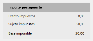 • Base imponible: Es el importe total sobre el que se calculan los impuestos aplicables al presupuesto. Se obtiene a partir de los conceptos sujetos a tributación y constituye la referencia a partir de la cual se determina el importe final del presupuesto.