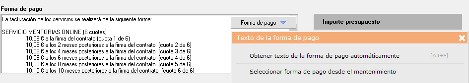 Este campo es obligatorio en el formulario, y en él se redacta el texto que se incluye en el documento impreso para indicar como se procederá al pago del contrato, formalizado el presupuesto. Su cumplimentación puede ser manual o automática: