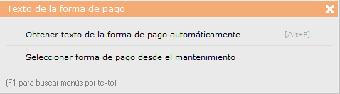 • Seleccionar forma de pago desde el mantenimiento: Esta opción permite abrir el mantenimiento predeterminado de formas de pago para poder añadir un texto predefinido por nosotros .