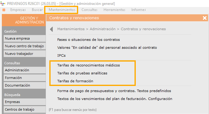 2. Tambien podremos acceder al Mantenimiento de las Tarifas desde el menú superior principal del módulo haciendo click en Mantenimientos > Administración > Contratos y renovaciones > Tarifas