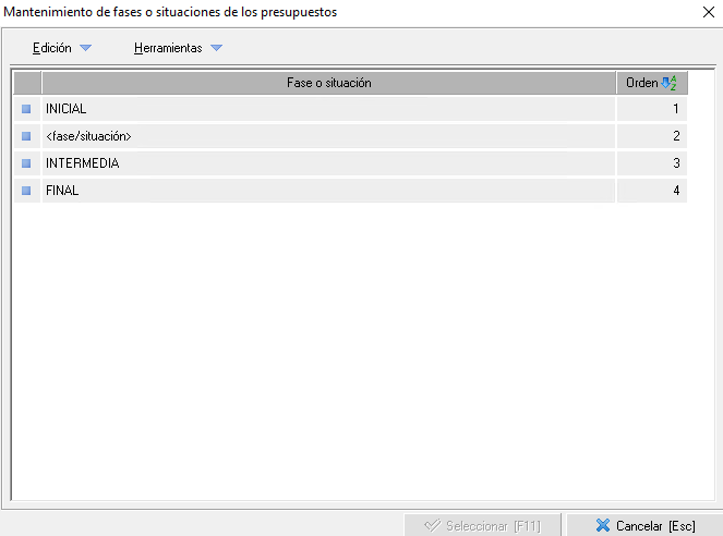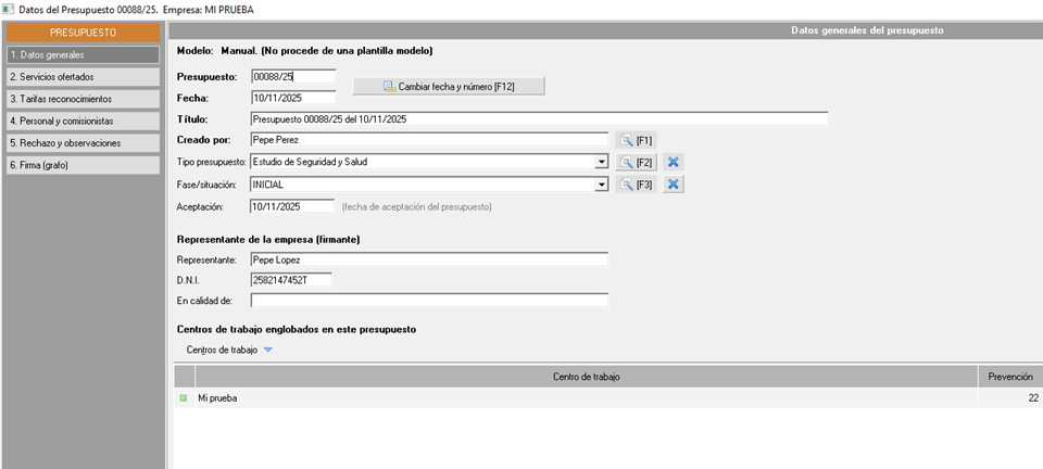 - Fase/situación. Permite establecer, bajo criterio del Servicio de prevención, cual es el estado del presupuesto desde su registro a su firma.
