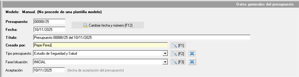 El primer bloque engloba los datos identificativos del presupuesto, fecha y tipología: