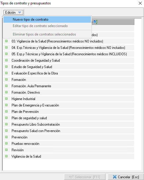 o desde el módulo ADM en el menú superior, Mantenimientos > Tipos de… > Contratos. Aquí podrémos crear o editar un nuevo tipo de contrato o presupuesto.