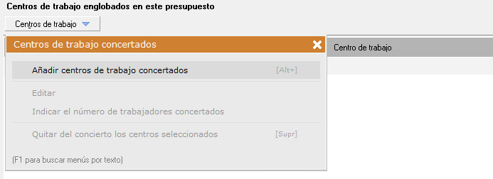 Es obligatorio definir que centros de trabajo están incluidos en el presupuesto, con lo cual en este apartado deberá detallarlos, además de los trabajadores por centro. Para añadir centros de trabajo al presupuesto vamos a utilizar el desplegable que vemos a continuación: