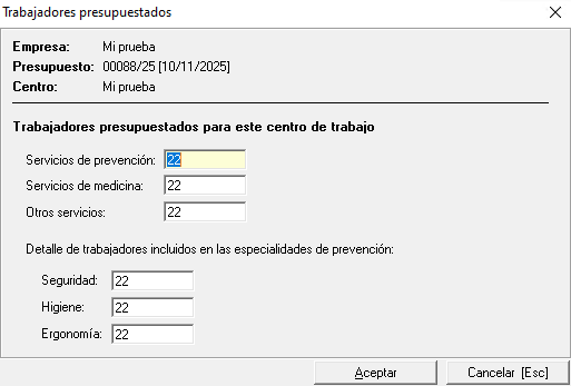 Editar datos del centro de trabajo seleccionado. Esta opción permite editar dicha información individualmente. El centro se carga en el presupuesto con el número de trabajadores concertados estandar por especialidad según la información de su ficha de datos de la empresa. Los cambios que hagámos desde aquí no cambiarán la ficha de la empresa, solo se cambiarán para el presupuesto.