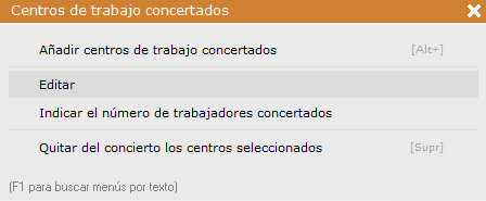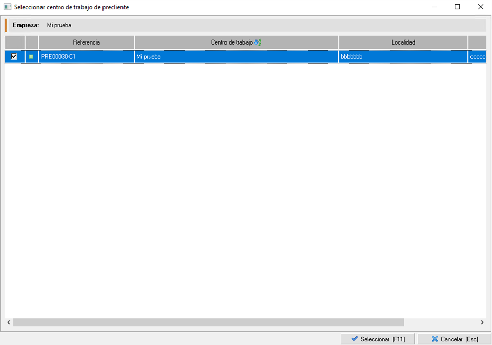 Añadir centros de trabajo concertados. Aquí añadirémos un centro de trabajo de la empresa al cual le aplicarémos el presupueso. Sólo tienes que marcar la casilla de la izquierda y pulsar en Seleccionar [F11].