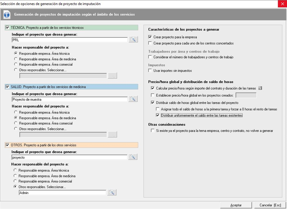 Con la primera opción generamos un único proyecto para cada contrato, teniendo en cuenta diferentes factores que explicaremos más adelante. En la segunda opción se tienen en cuenta los servicios incluidos en el contrato, de tal manera que se puede crear un proyecto para cada especialidad incluida en el contrato. en este caso, si un contrato tiene las 3 especialidades, podemos crear un proyecto con los servicios técnicos, otro para los de medicina y un tercer proyecto para los servicios de la especialidad "otros".