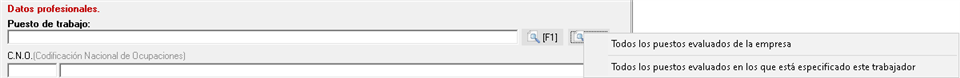 También dispone del botón [F4], que le permite seleccionar entre cualquier puesto preventivo ya evaluados en la empresa con la opción Todos los puestos evaluados de la empresa o sólo entre aquellos en los que se ha especificado el trabajador con Todos los puestos evaluados en los que está especificado este trabajador. Se tendrán en cuenta todas las evaluaciones vigentes y en desarrollo.
