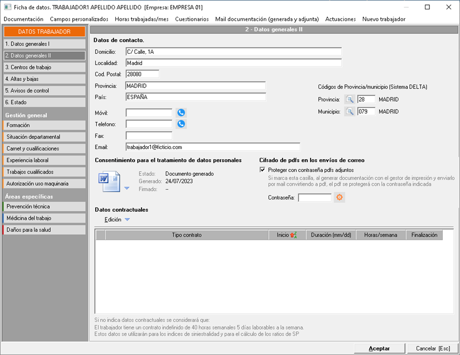 A diferencia de la pestaña anterior, en esta no tenemos campos obligatorios, pero si campos importantes. A parte de la dirección del trabajador o el número de teléfono, un campo muy importante es el correo electrónico. Este campo es necesario tanto para enviarle documentación por email como para poder crearle un usuario web con el que pueda acceder a la web del trabajador.