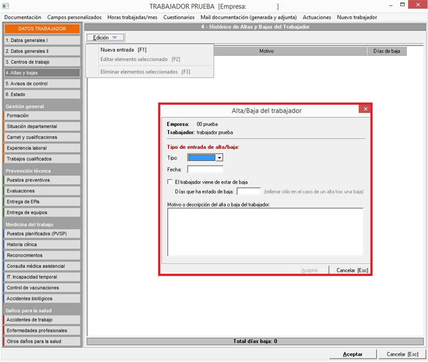 Cuando demos de alta, o editemos una existente, un registro nos aparecerá la ventana que vemos en el recuadro con borde rojo. En esta ventana estableceremos el tipo de registro que estamos haciendo (si es alta o baja) y fijaremos la fecha del mismo. Podemos establecer si el alta del trabajador se produce porque viene de estar de baja. Fijaremos el total de días que ha estado de baja el trabajador y tenemos un cuadro de texto para escribir el motivo o descripción del alta o baja del trabajador.