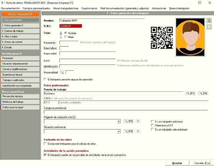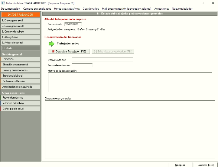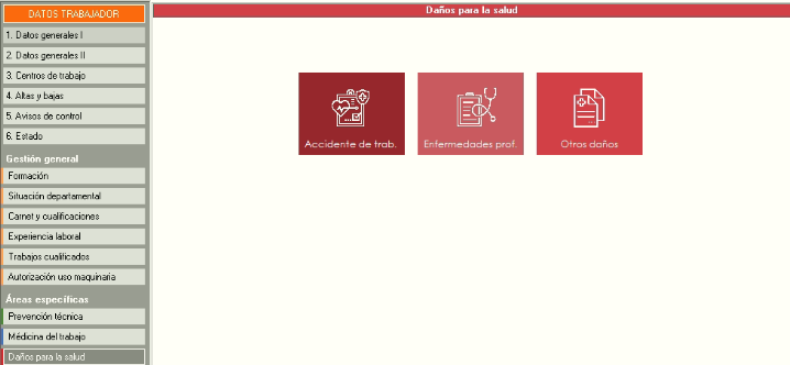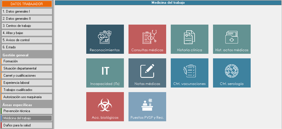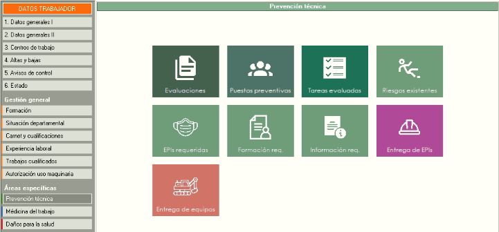 Por último, disponemos de un acceso desde la ficha del trabajador a sus diferentes áreas personales de gestión general, prevención técnica, medicina del trabajo y daños para la salud.